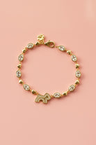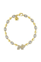 Features a crystal CZ studded chain with gold heart detail, and is centered around a gold dipped crystal CZ studded logo. Made from high quality 24k gold plated brass and finished with a lobster closure.