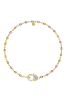 Features a meticulously crafted pale pink CZ and gold heart studded chain,centered by a statement clasp adorned with a pale pink CZ heart, and crystal CZ studs. Made from high quality 24k gold plated brass. Finished with our signature paw print tag.