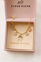 Classic and dainty charm bracelet featuring custom, CZ studded paw, heart, rainbow, and butterfly charms along with a pink enamel flower. Made with high quality 24k gold plated brass and finished with a lobster clasp.
