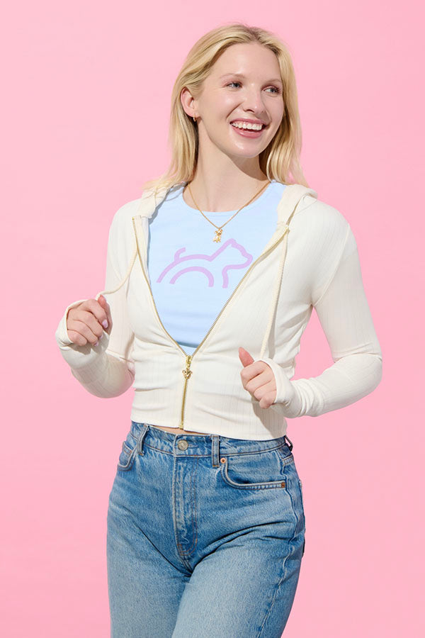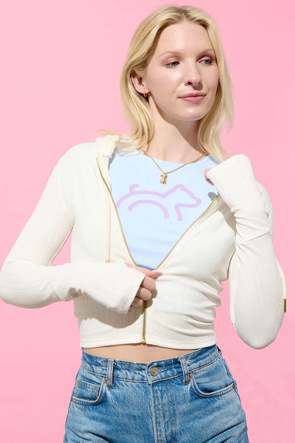 Our chic Ribbed Logo Hoodie in off-white features a stunning custom pit bull zipper center, and elevated gold engraved detail accenting the drawstrings. Cut from an ultra-soft ribbed Tencel blend, this hoodie is lightweight & comfortable, and easy to wear alone or layered over your favorite tops. This style also features delicate hood embroidery, and thumbholes for extra comfort.