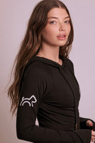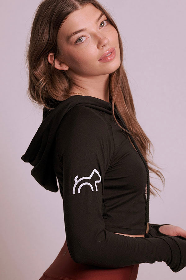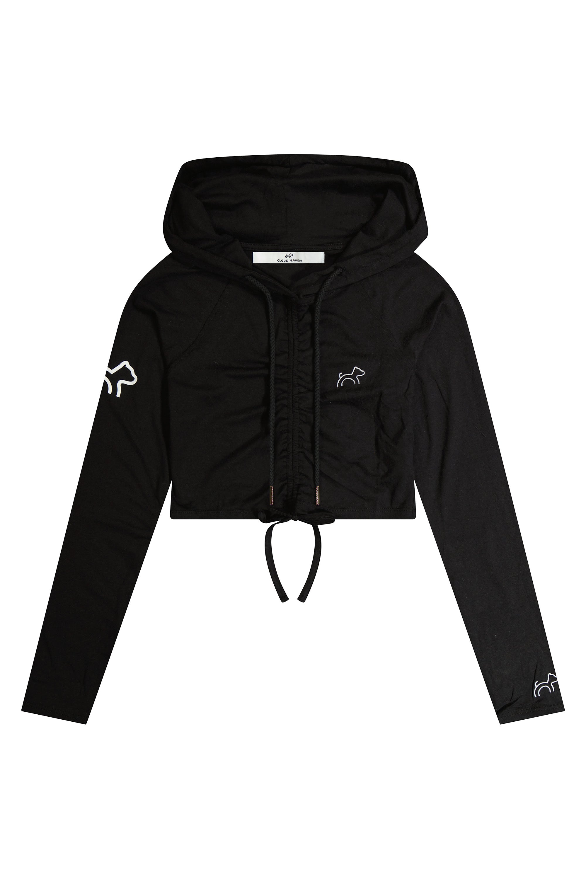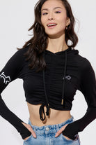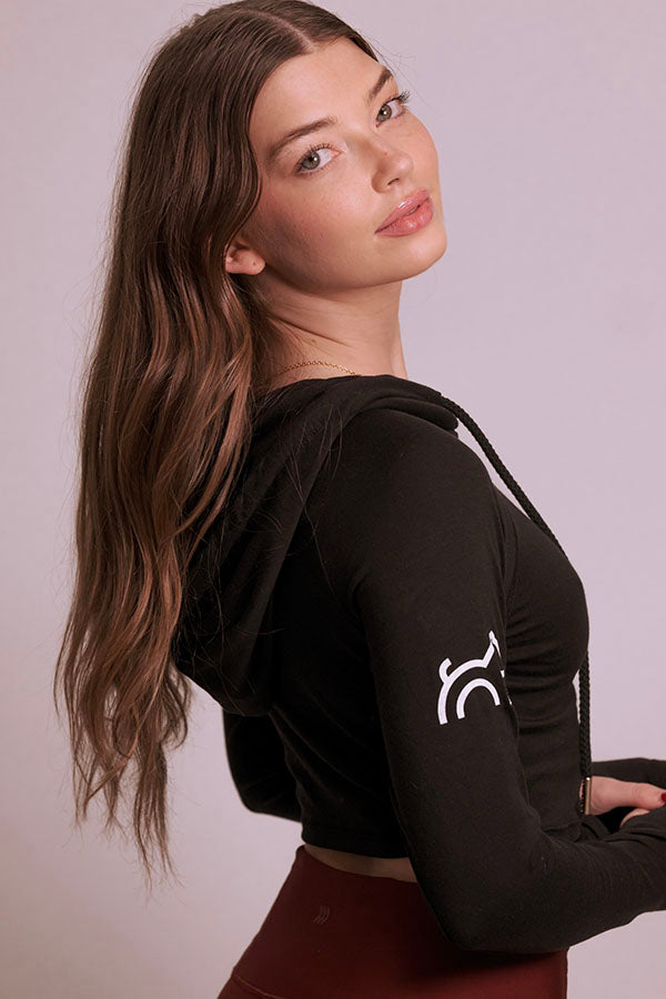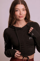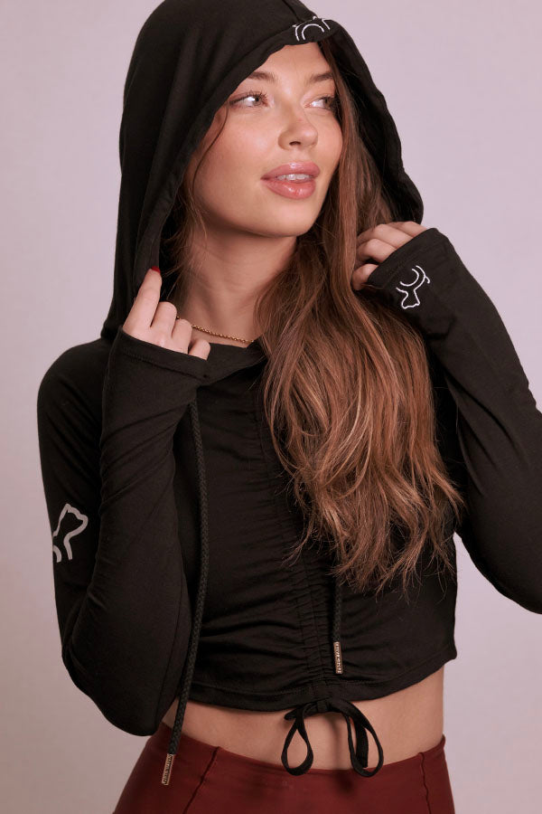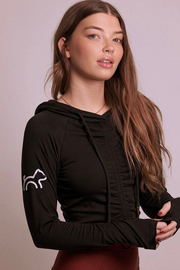 Our Cloud Haven Ruched Logo Hoodie in black features chic embroidery and an adjustable cropped fit. Cut from ultra-soft Tencel lyocell and organic cotton, this style is lightweight and easy to wear alone or layered over your favorite top. Whether coming from the gym or running errands this versatile must have wardrobe addition is the definition of effortless style.