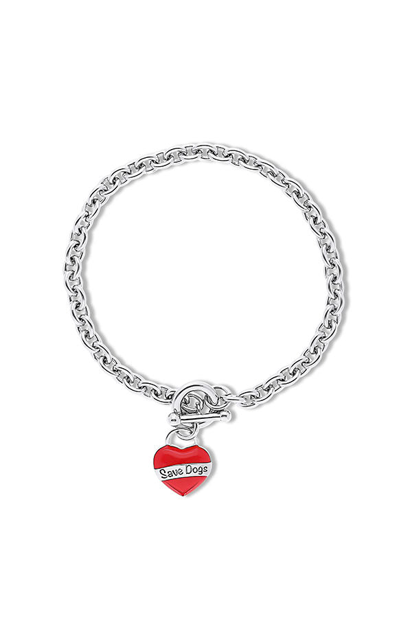 Classic and chic, we dressed up this red enamel painted heart tag bracelet with a delicate statement cable chain, front clasp detail, & meaningful “Save Dogs” engraving. Part of our “Just One Wish” collection, this piece is crafted from premium rhodium plated brass and measures 6.75 inches in length.