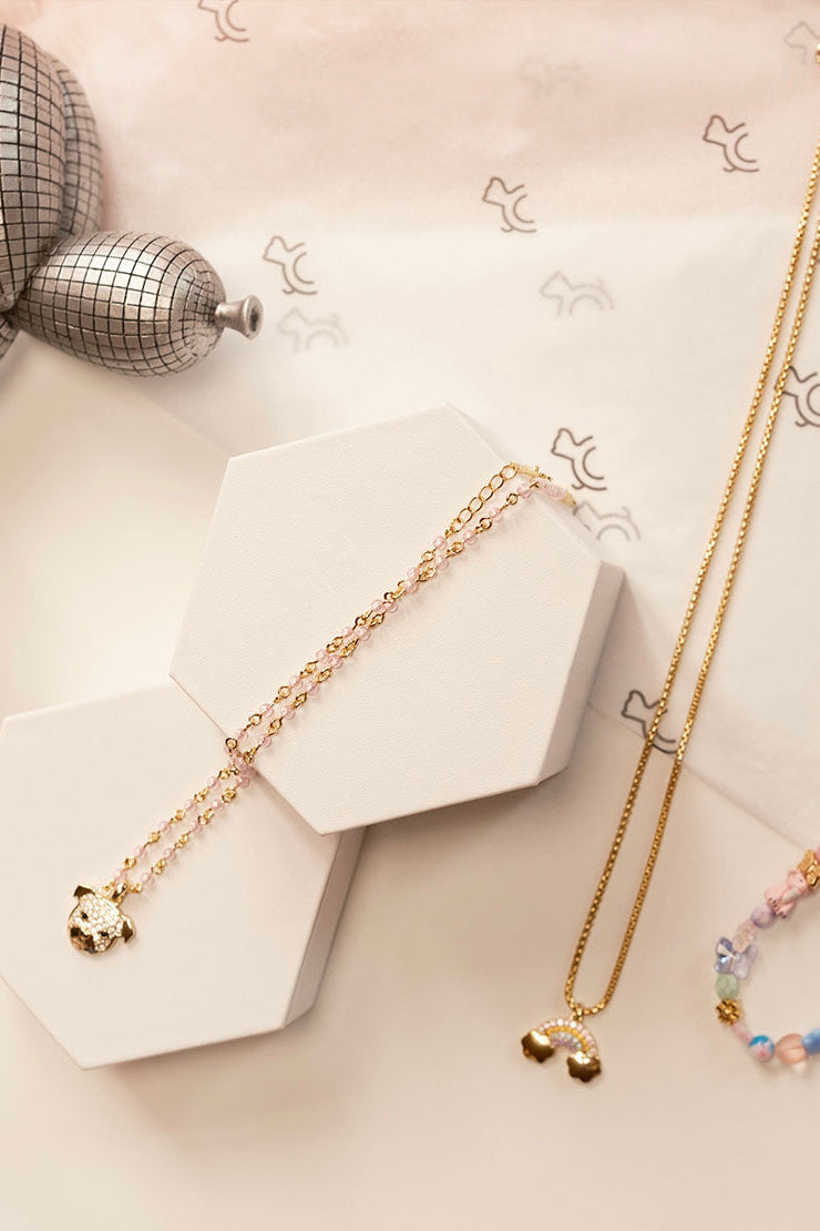 Created with a delicate, pale pink CZ studded chain centered around a custom CZ Pit Bull pendant. Made from high quality 24k gold plated brass and finished with a lobster clasp and our signature paw print tag.