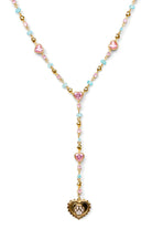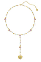 Rosary style necklace adorned with multicolored stones to create a bezel set chain all centered around a custom paw print pendant. Made with high quality 24k gold plated brass and finished with a lobster clasp and our signature paw print tag.