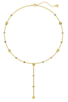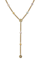 Features a whimsical multicolor CZ stone and floating charm chain, centered by a delicate paw print pendant. Made with high quality 24k gold plated brass and finished with a lobster clasp closure and our signature paw print tag.