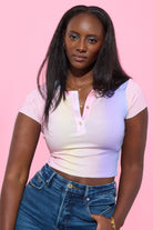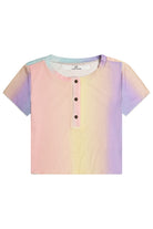 Our Dainty Logo Tee is cut from an ultra-soft Tencel Modal blend, and has a flattering body hugging cropped fit. This fashion top has a soft rainbow ombré print, and one of a kind gold buttons with logo detail.