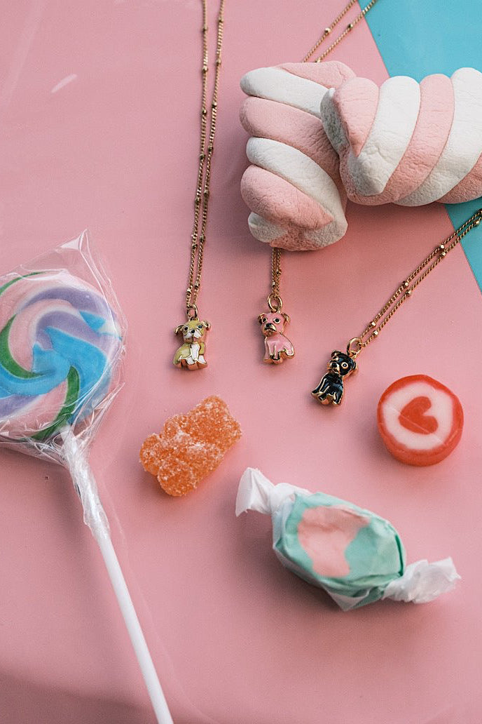 Our sweet as candy Mini Bulldog Pendant in Taffy Yellow is too cute for words. These adorable 24k gold plated pedants are enamel plated in limited edition colors, and are beautifully accented by a delicate beaded chain. Sized at 15” with a 3” extender, and finished with a lobster clasp and our signature paw print tag. These cuties are perfect for layering or gifting.