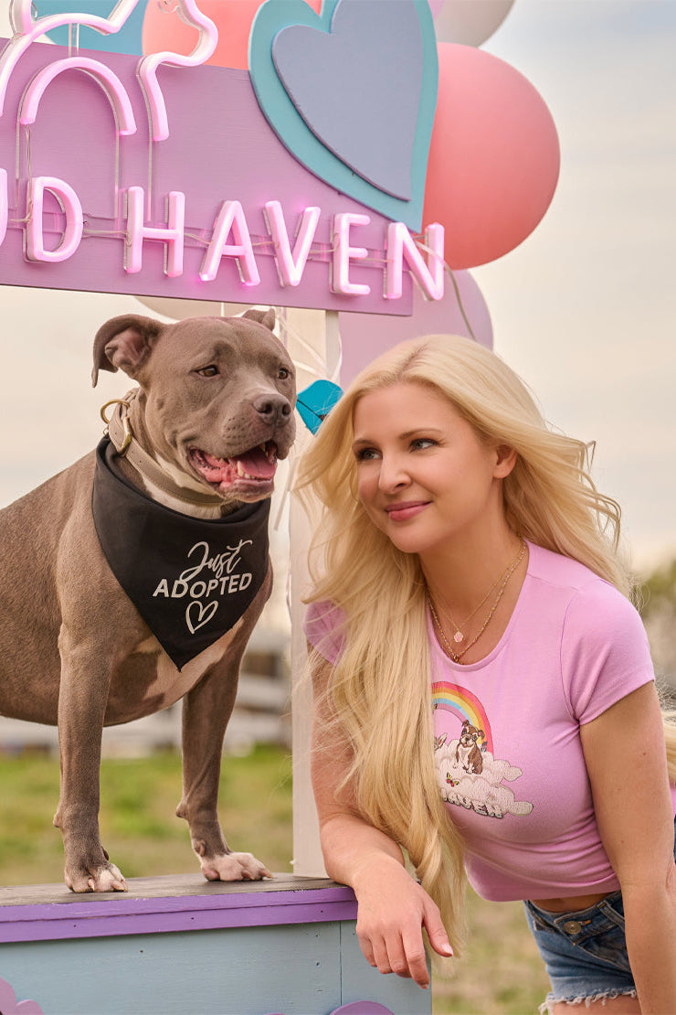 The Heavenly Tee in pink is cut from organic cotton and comes in a beautiful, pastel color that is perfect for a stylish pop of color. This baby tee features our Cloud Haven Sweet Shelter Dogs rainbow graphic which gives it a nostalgic design. With a crew neck and short sleeves, this tee has a comfortable and slim fit.