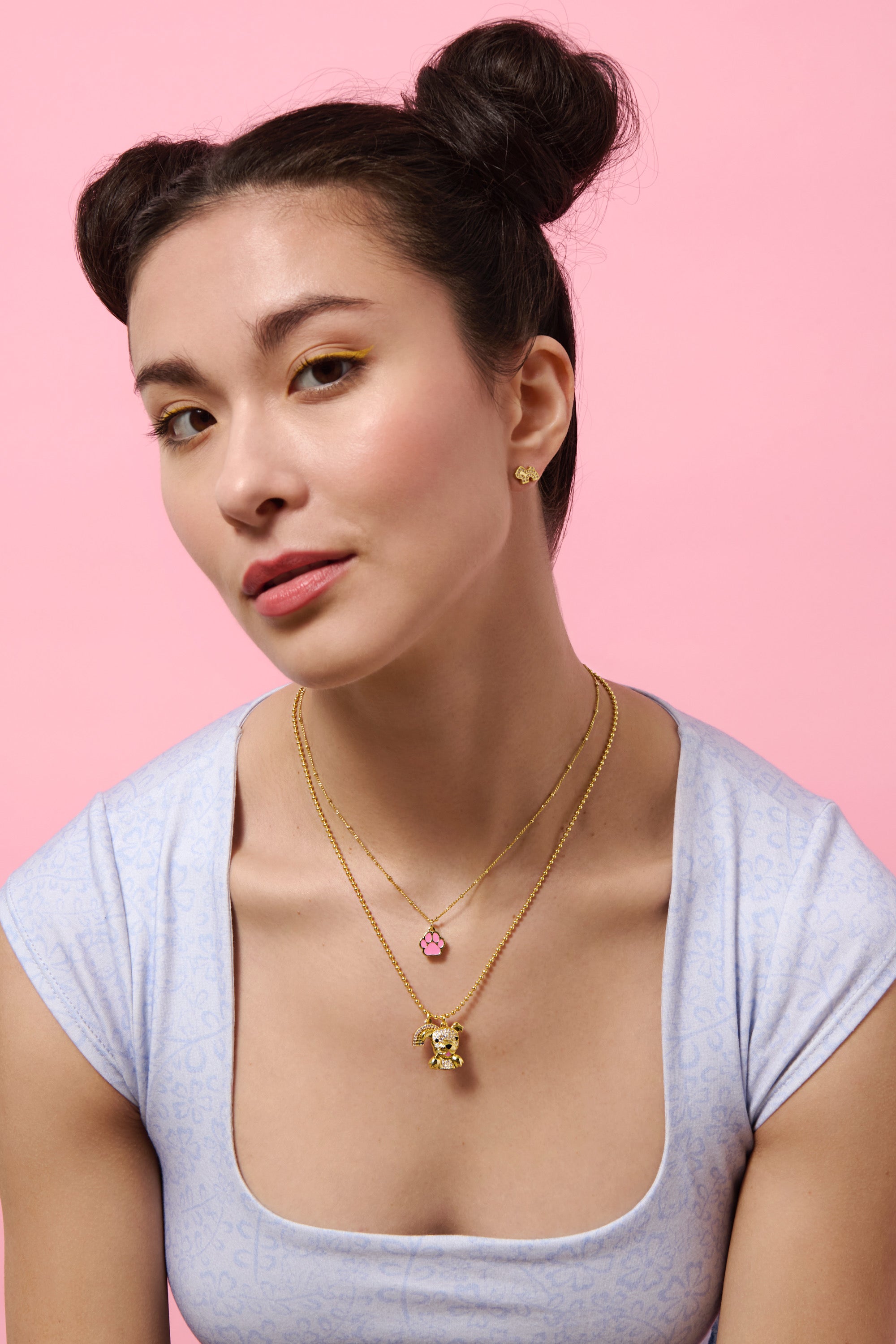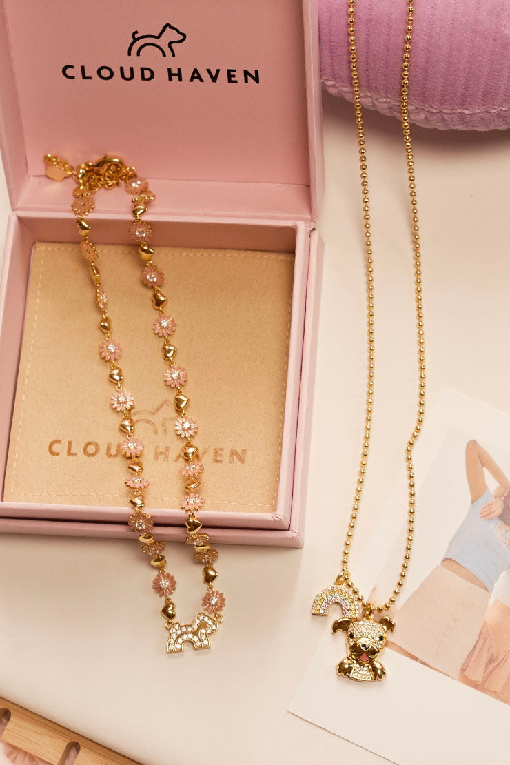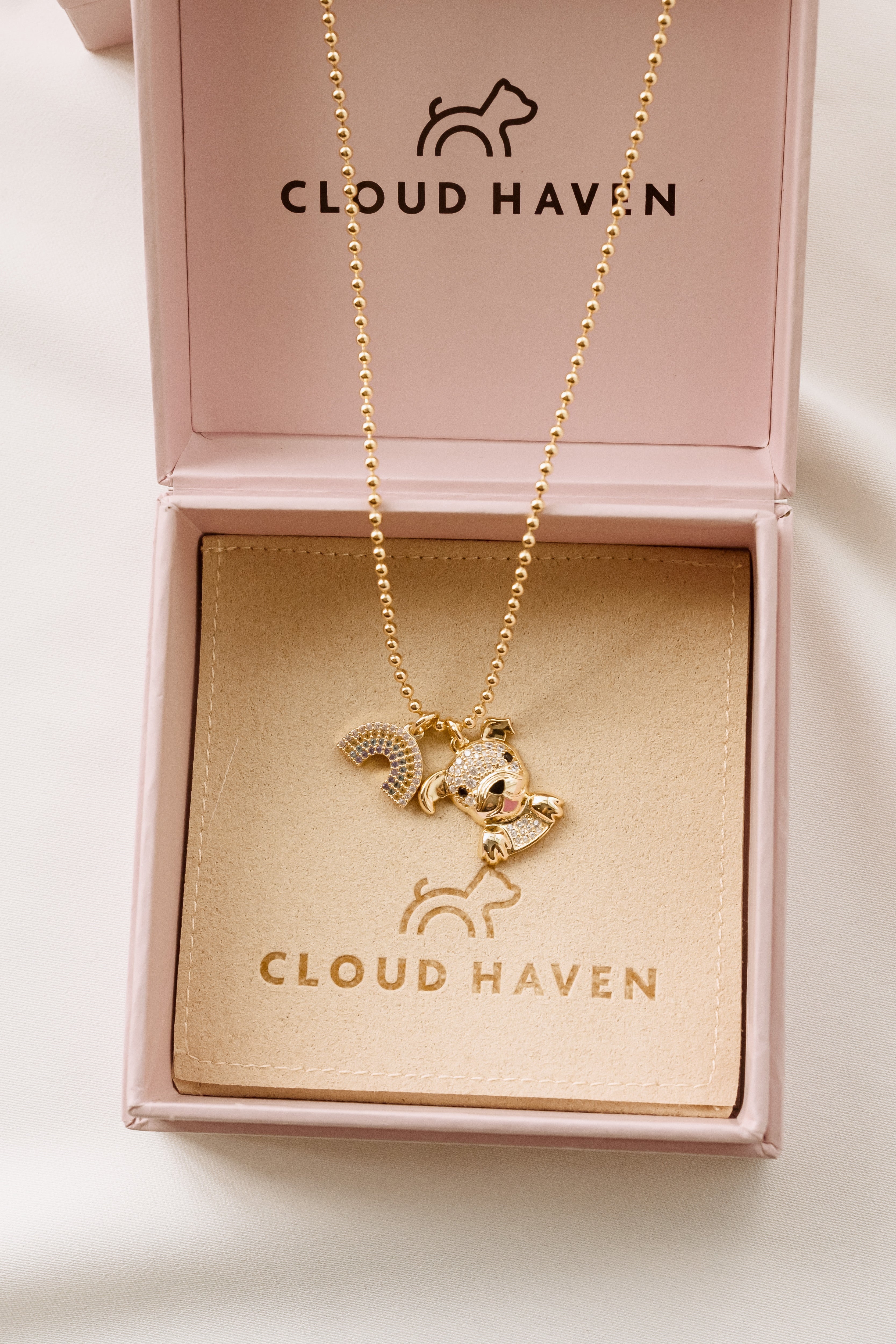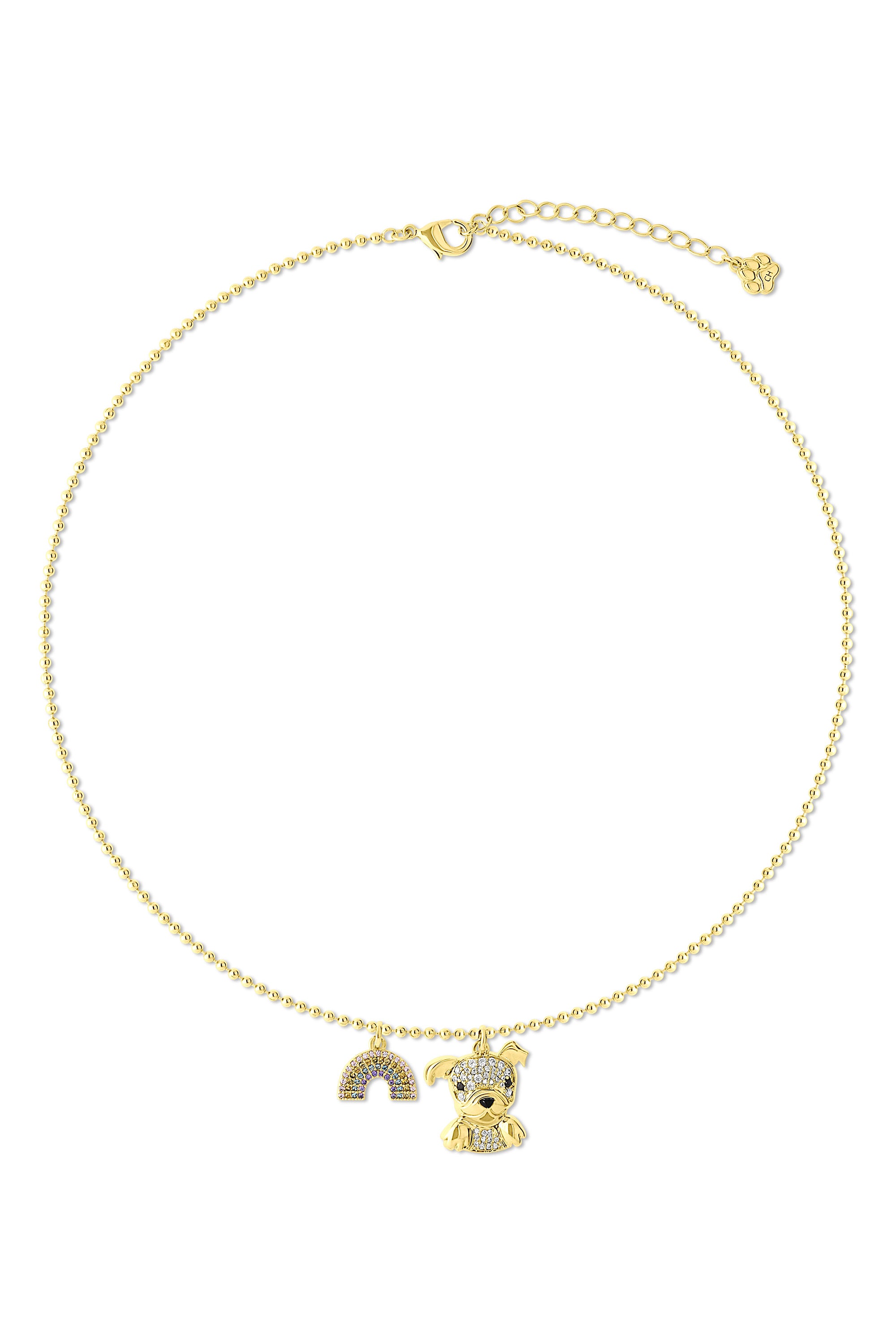 A dainty chain anchored by custom made, CZ studded Pittie and rainbow pendants. Made with high quality 24k gold plated brass and finished with a lobster clasp and our signature paw print tag.
